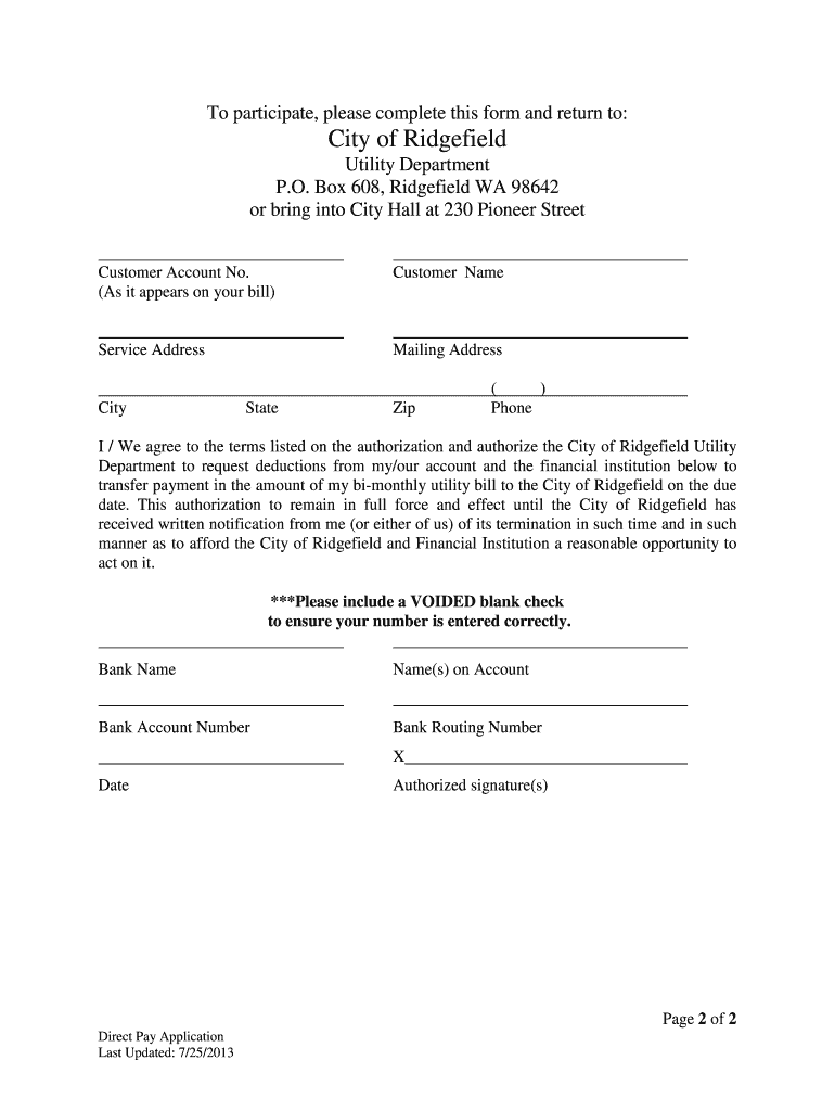 You will need your Customer Account No., Customer Name, Service Address, Bank details, and a voided check to complete the City of Ridgefield Direct Pay Application.