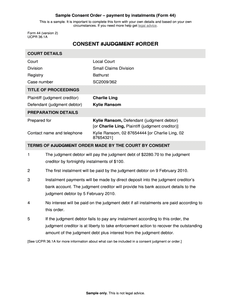 Sample Consent Order payment by installments (Form 44) This is a sample. It is important to complete this form with your own details and based on your own circumstances. If you need more help get