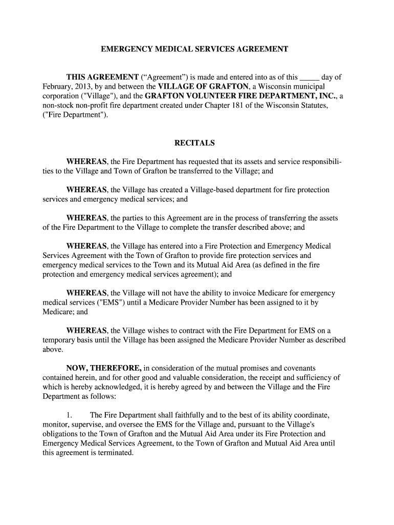 Get the free EMERGENCY MEDICAL SERVICES AGREEMENT - bGraftonb