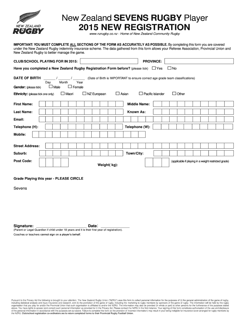 New Zealand SEVENS RUGBY Player 2015 NEW REGISTRATION www.nzrugby.co.nz Home of New Zealand Community Rugby IMPORTANT: YOU MUST COMPLETE ALL SECTIONS OF THE FORM AS ACCURATELY AS POSSIBLE. By completing