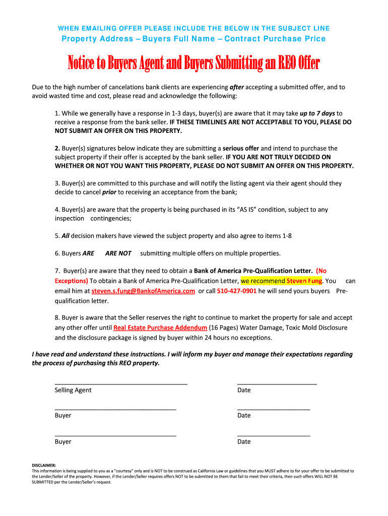 WHEN EMAILING OFFER PLEASE INCLUDE THE BELOW IN THE SUBJECT LINE Property Address Buyers Full Name Contract Purchase Price Notices to Buyers Agent and Buyers Submitting an RED Offer Duetothehighnumberofcancelationsbankclientsareexperiencingafteracceptingasubmittedoffer,