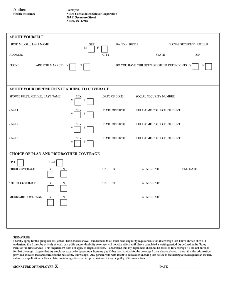Anthem Employer: Attica Consolidated School Corporation 205 E. Sycamore Street Attica, IN 47918 Health Insurance ABOUT YOURSELF FIRST, MIDDLE, LAST NAME SEX M DATE OF BIRTH ADDRESS PHONE CITY ARE