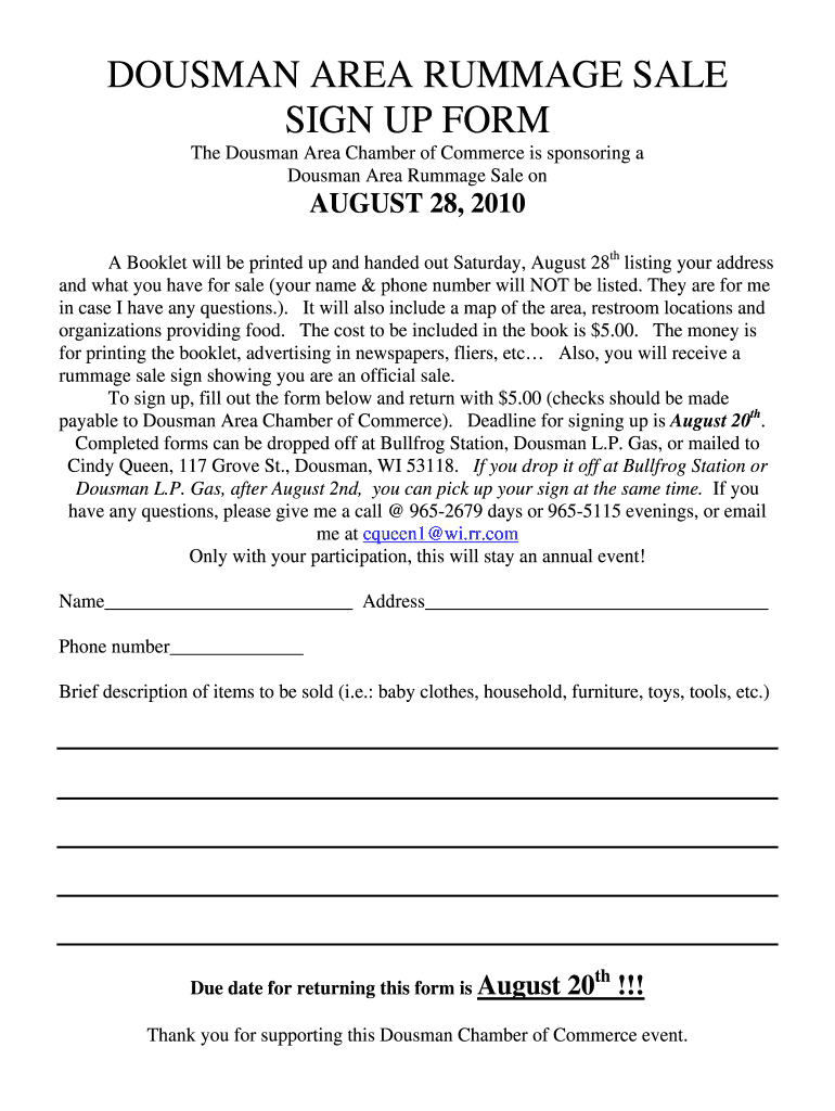 Residents of the Dousman area who wish to participate in the rummage sale are required to file the Dousman Area Rummage Sale Sign Up Form.