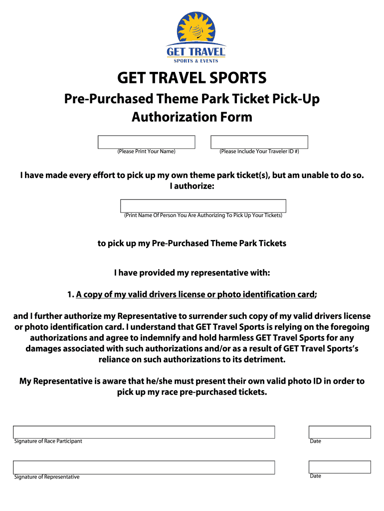 GET TRAVEL SPORTS PrePurchased Theme Park Ticket Pickup Authorization Form (Please Print Your Name) (Please Include Your Traveler ID #) I have made every effort to pick up my own theme park ticket’s),
