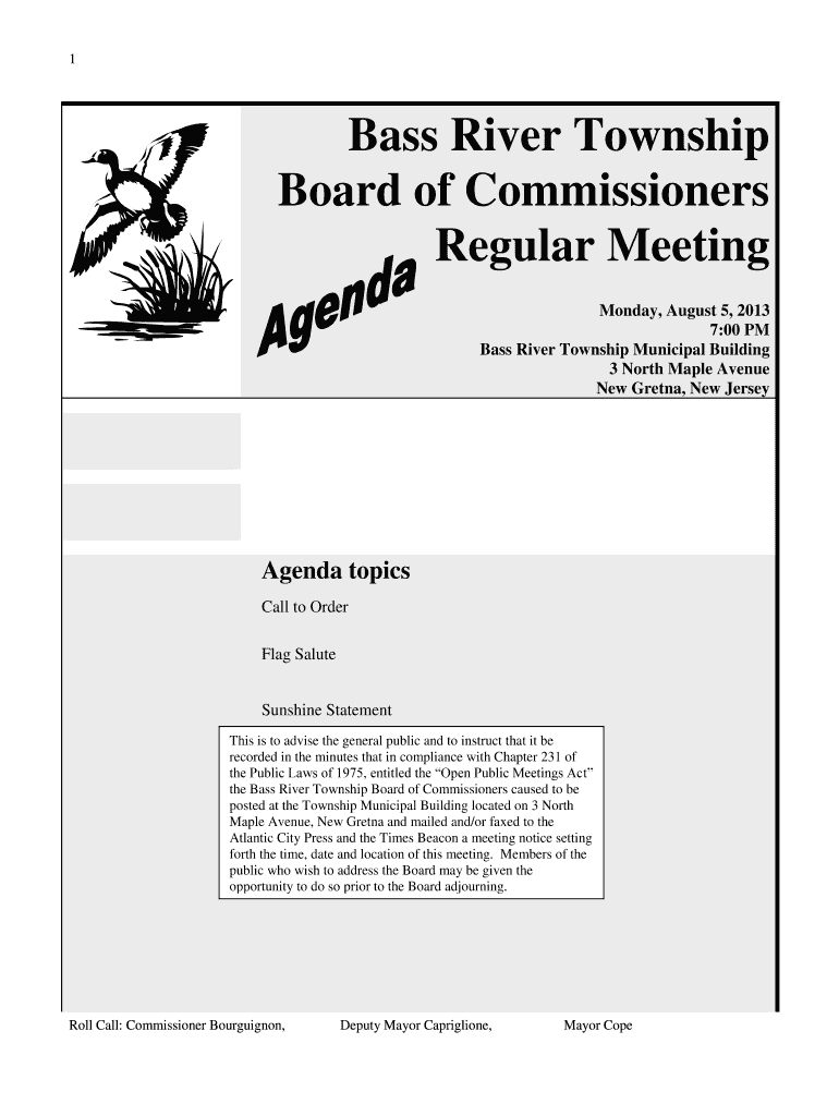 1 Bass River Township Board of Commissioners Regular Meeting Monday, August 5, 2013 7:00 PM Bass River Township Municipal Building 3 North Maple Avenue New Greta, New Jersey Agenda topics Call to