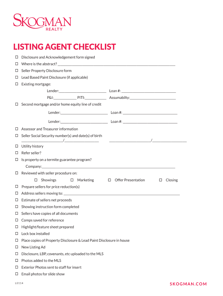 LISTING AGENT CHECKLIST o Disclosure and Acknowledgement form signed o Where is the abstract? O Seller Property Disclosure form o Lead Based Paint Disclosure (if applicable) o Existing mortgage: Lender:
