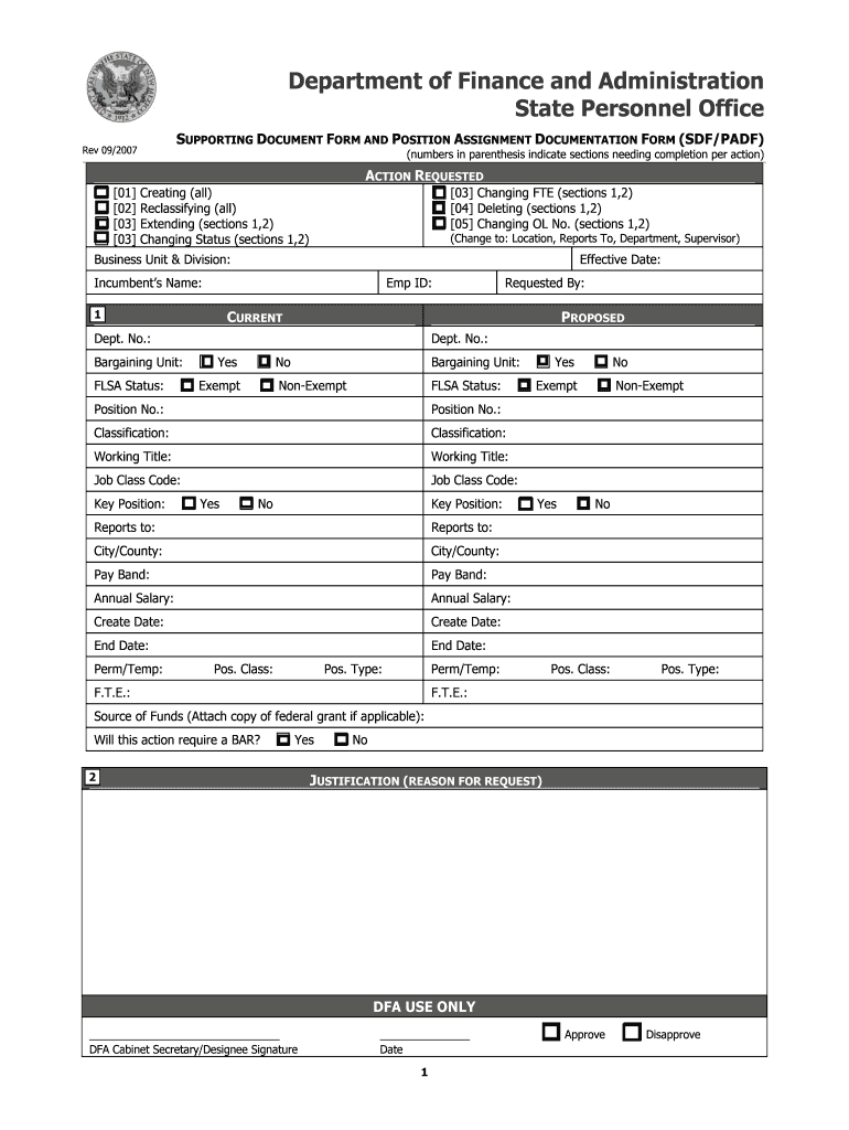 The Supporting Document Form and Position Assignment Documentation Form is an employment document used by the Department of Finance and Administration to create, change, reclassify, delete, or extend positions.