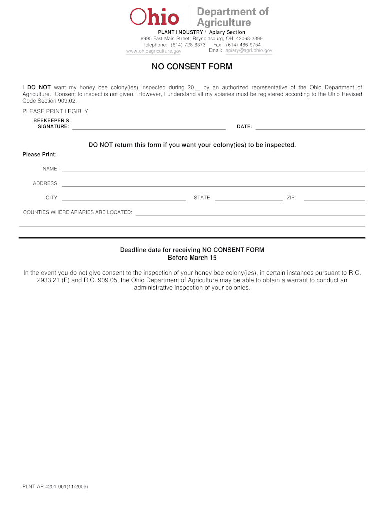 PLANT INDUSTRY / Apiary Section 8995 East Main Street, Reynoldsburg, OH 430683399 Telephone: (614× 7286373 Fax: (614× 4669754 Email: apiary Agra.Ohio.gov www.ohioagriculture.gov NO CONSENT FORM