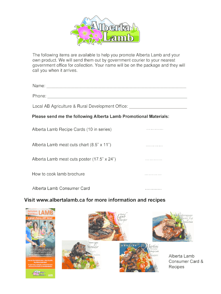 The following items are available to help you promote Alberta Lamb and your own product. We will send them out by government courier to your nearest government office for collection. Your name will