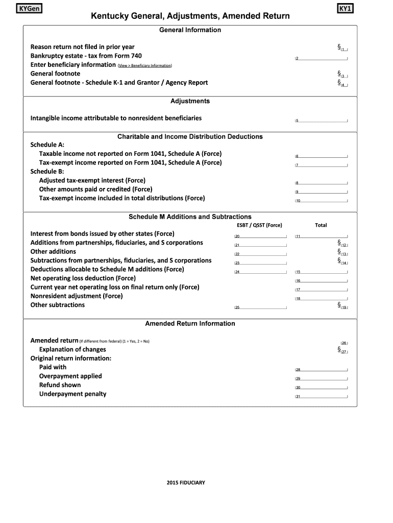 KY Gen KY1 KY Gen (2015) Kentucky General, Adjustments, Amended Return General Information Reason return not filed in prior year Bankruptcy estate tax from Form 740 Enter beneficiary information (View