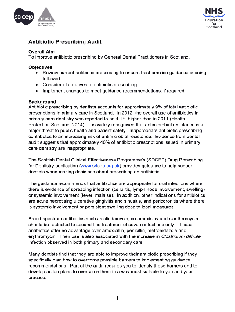 Antibiotic Prescribing Audit Overall Aim To improve antibiotic prescribing by General Dental Practitioners in Scotland. Objectives Review current antibiotic prescribing to ensure best practice guidance