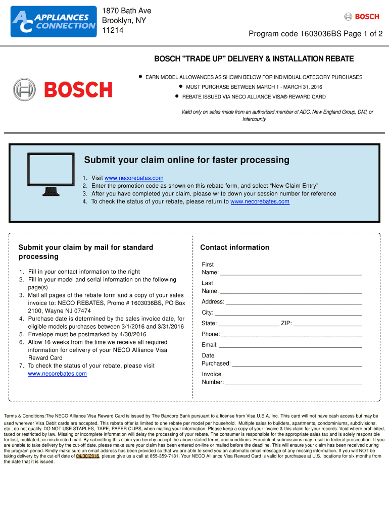 1870 Bath Ave Brooklyn, NY 11214 Program code 1603036BS Page 1 of 2 BOSCH “TRADE UP DELIVERY & INSTALLATION REBATE EARN MODEL ALLOWANCES AS SHOWN BELOW FOR INDIVIDUAL CATEGORY PURCHASES MUST PURCHASE