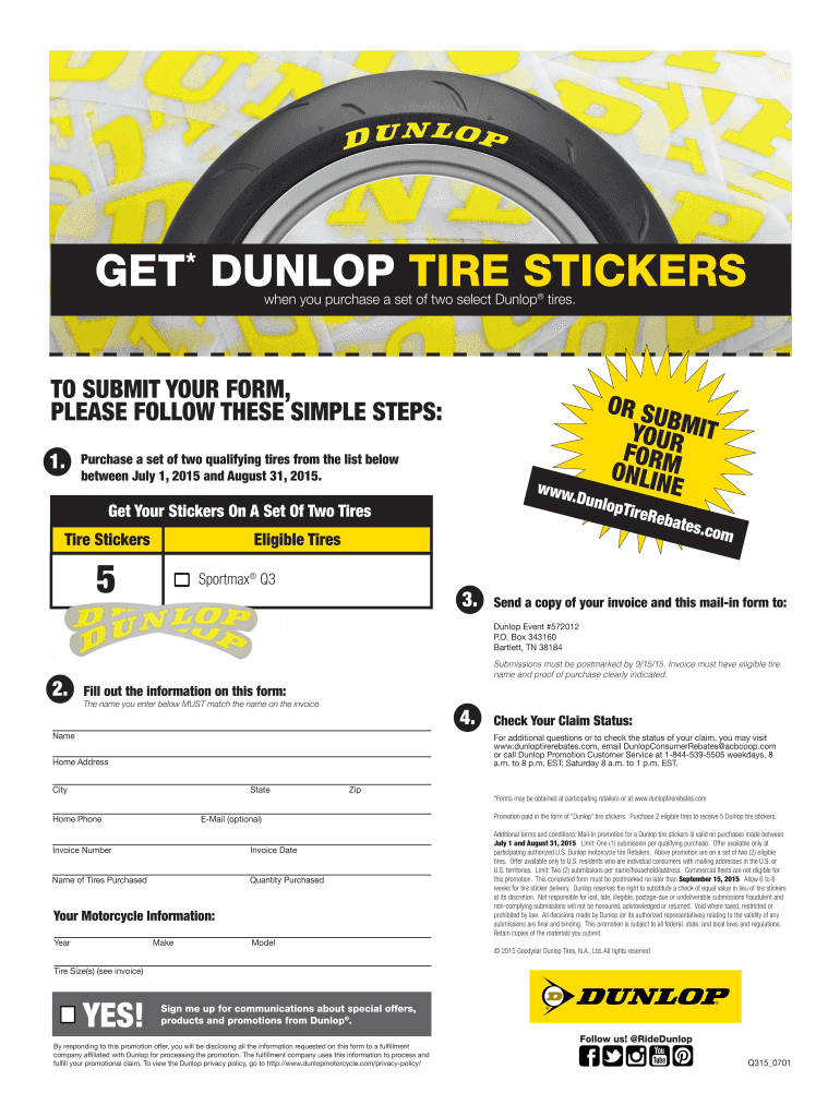 You can fill out the Dunlop tire sticker application form online or by contacting Dunlop directly for the necessary steps.