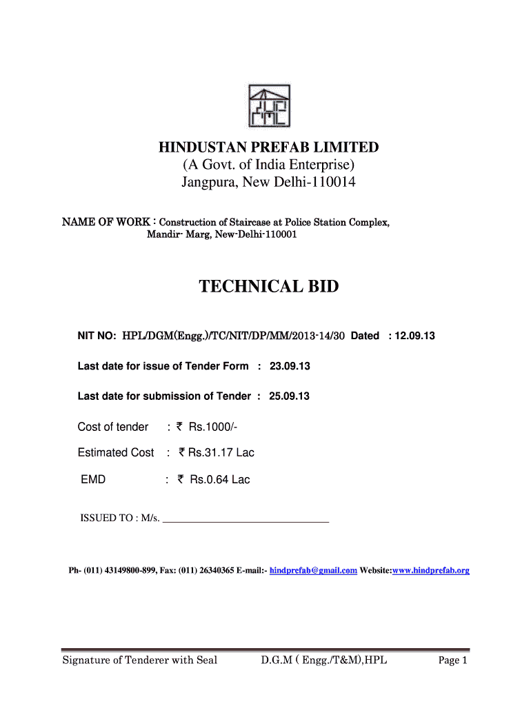 HINDUSTAN PREFAB LIMITED (A Govt. of India Enterprise) Jayapura, New Delhi110014 NAME OF WORK : Construction of Staircase at Police Station Complex, Manner Mary, NewDelhi110001 TECHNICAL BID NIT NO: