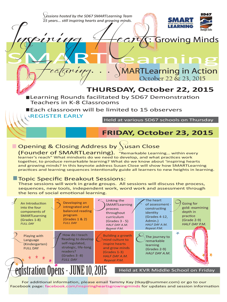 Sessions hosted by the SD67 Smartening Team 15 years... s ll inspiring hearts and growing minds. Inspiring Hearts: Growing Minds Smartening Featuring. . . Smartening in Action October 22 & 23, 2015