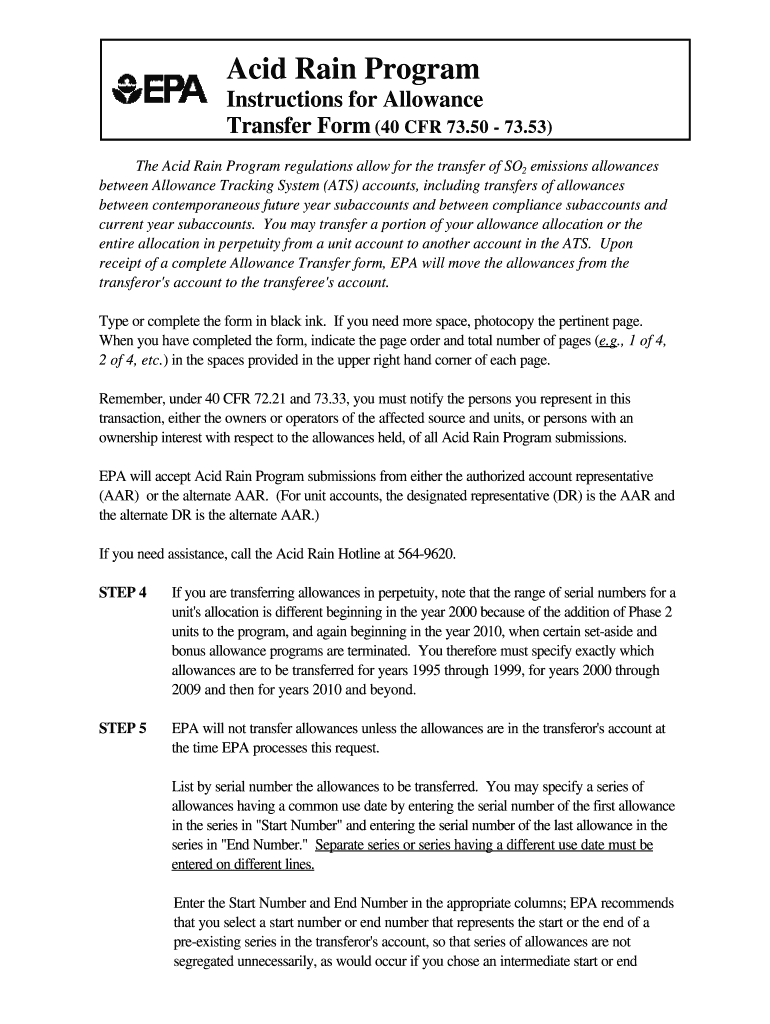 Acid Rain Program Instructions for Allowance Transfer Form (40 CFR 73.50 73.53) The Acid Rain Program regulations allow for the transfer of SO2 emissions allowances between Allowance Tracking System