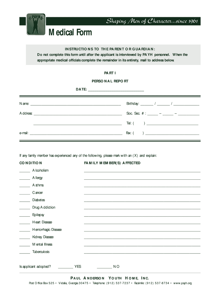 Shaping Men of Character...since 1961 Medical Form INSTRUCTIONS TO THE PARENT OR GUARDIAN: Do not complete this form until after the applicant is interviewed by PAY personnel. When the appropriate