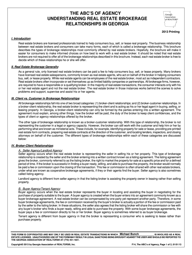 THE ABC S OF AGENCY UNDERSTANDING REAL ESTATE BROKERAGE RELATIONSHIPS IN GEORGIA 2013 Printing I. Introduction: Real estate brokers are licensed professionals trained to help consumers buy, sell,
