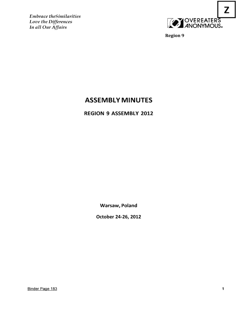 Z Embrace similarities Love the Differences In all Our Affairs Region9 ASSEMBLYMINUTES REGION9ASSEMBLY2012 Warsaw, Poland October2426,2012 Binder Page 183 1 Z Embrace the Similarities Love the Differences