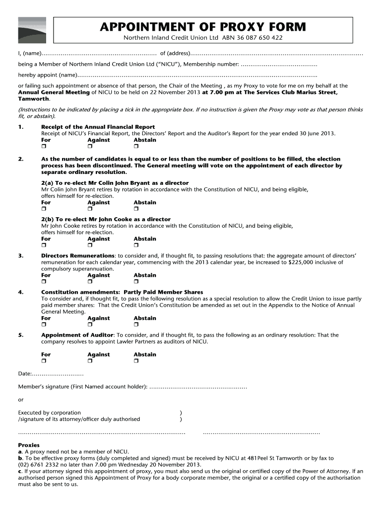 APPOINTMENT OF PROXY FORM Northern Inland Credit Union Ltd ABN 36 087 650 422 I, (name) of (address) being a Member of Northern Inland Credit Union Ltd (NICU×, Membership number:. Hereby appoint