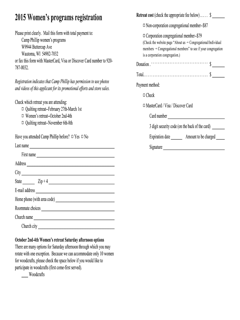 2015 Women's programs registration Retreat cost (check the appropriate fee below). . . . . $9 Noncorporation congregational member×87 Please print clearly. Mail this form with total payment to: Camp