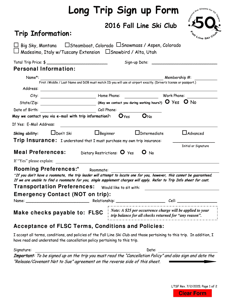 Long Trip Sign up Form 2016 Fall Line Ski Club Trip Information: Big Sky, Montana Steamboat, Colorado Snow mass / Aspen, Colorado Massimo, Italy w×Tuscany Extension Snowbird / Alta, Utah Total Trip