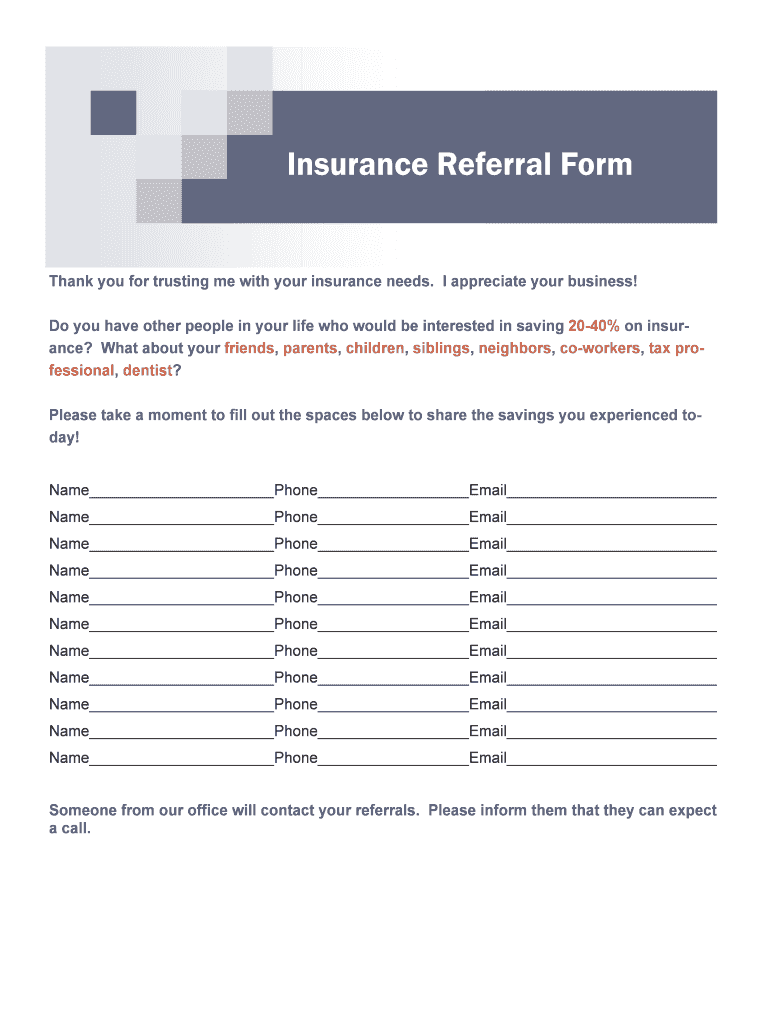 Insurance Referral Form Thank you for trusting me with your insurance needs. I appreciate your business! Do you have other people in your life who would be interested in saving 2040% on insurance?