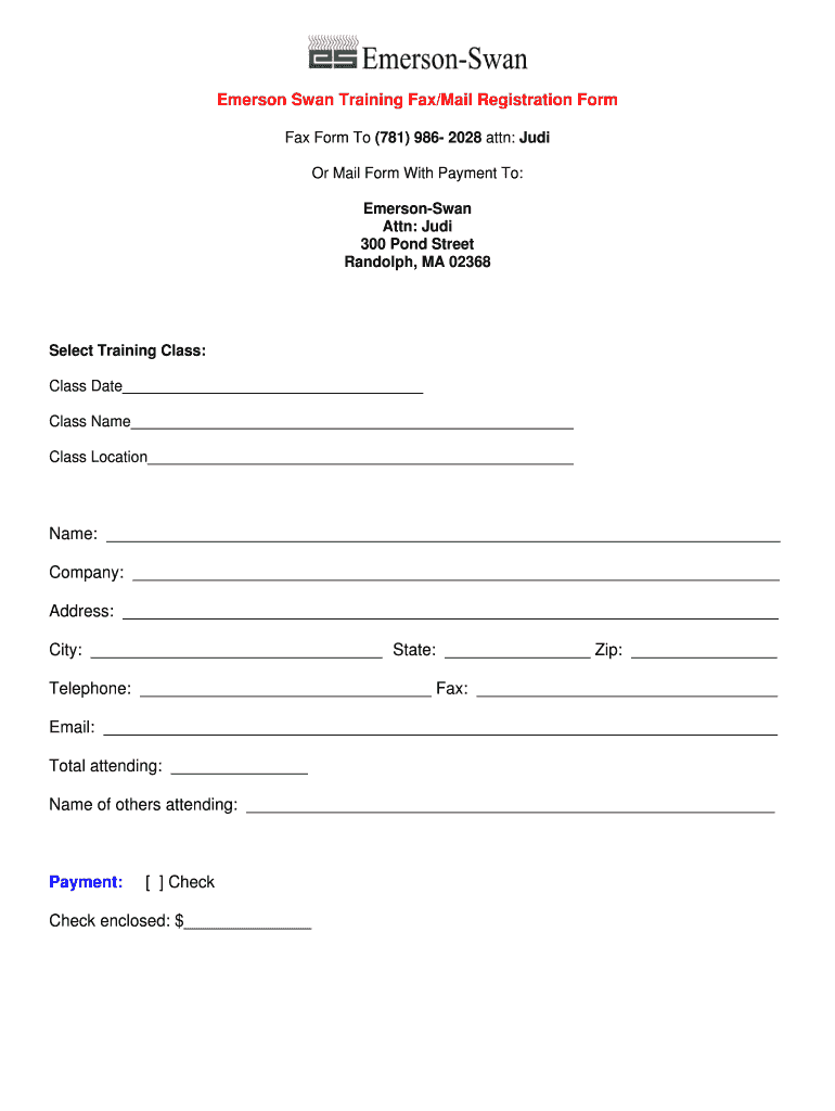 Emerson Swan Training Fax×Mail Registration Form Fax Form To (781× 986 2028 attn: Audi Or Mail Form With Payment To: EmersonSwan Attn: Audi 300 Pond Street Randolph, MA 02368 Select Training Class: