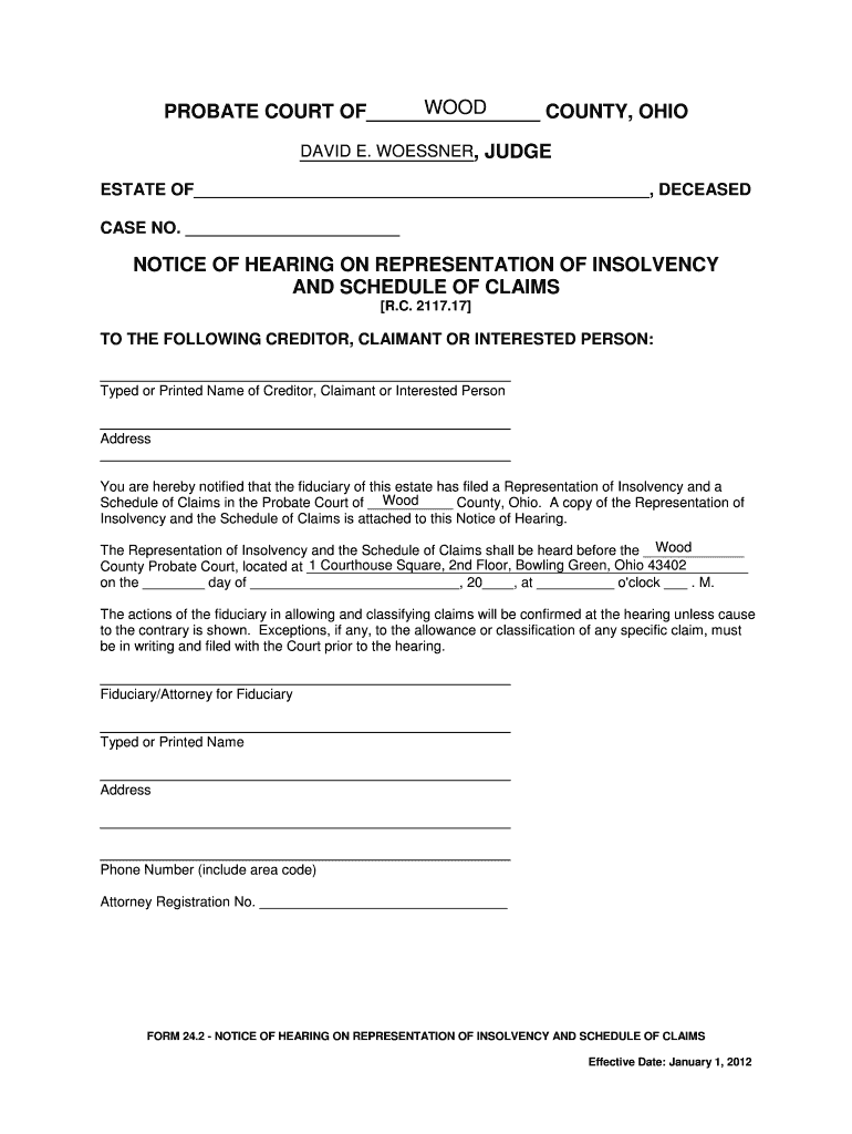 WOOD PROBATE COURT OF COUNTY, OHIO DAVID E. LESSER, JUDGE ESTATE OF, DECEASED CASE NO. NOTICE OF HEARING ON REPRESENTATION OF INSOLVENCY AND SCHEDULE OF CLAIMS R.C. 2117.17 TO THE FOLLOWING CREDITOR,