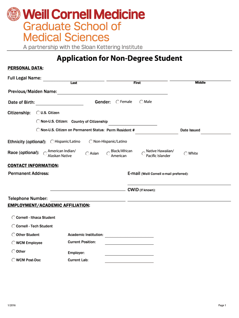 Application for NonDegree Student. PERSONAL DATA: Full Legal Name: Last First Middle. Previous×Maiden Name: Date of Birth: Gender: Female. Male U.S. Citizen.