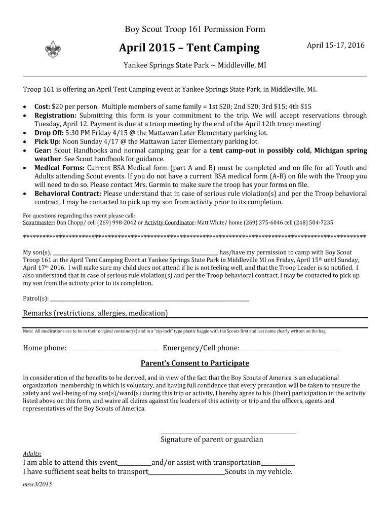 Boy Scout Troop 161 Permission Form April 2015 Tent Camping April 1517, 2016 Yankee Springs State Park Mandeville, MI Troop 161 is offering an April Tent Camping event at Yankee Springs State Park,
