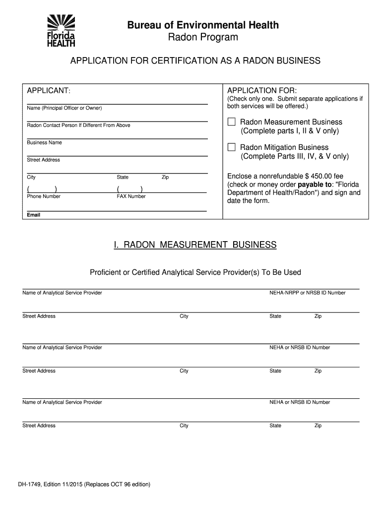 Bureau of Environmental Health Radon Program APPLICATION FOR CERTIFICATION AS A RADON BUSINESS APPLICANT: APPLICATION FOR: Name (Principal Officer or Owner) (Check only one. Submit separate applications