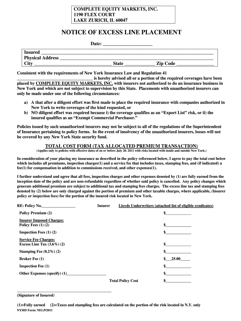 Get the free NOTICE OF EXCESS LINE PLACEMENT