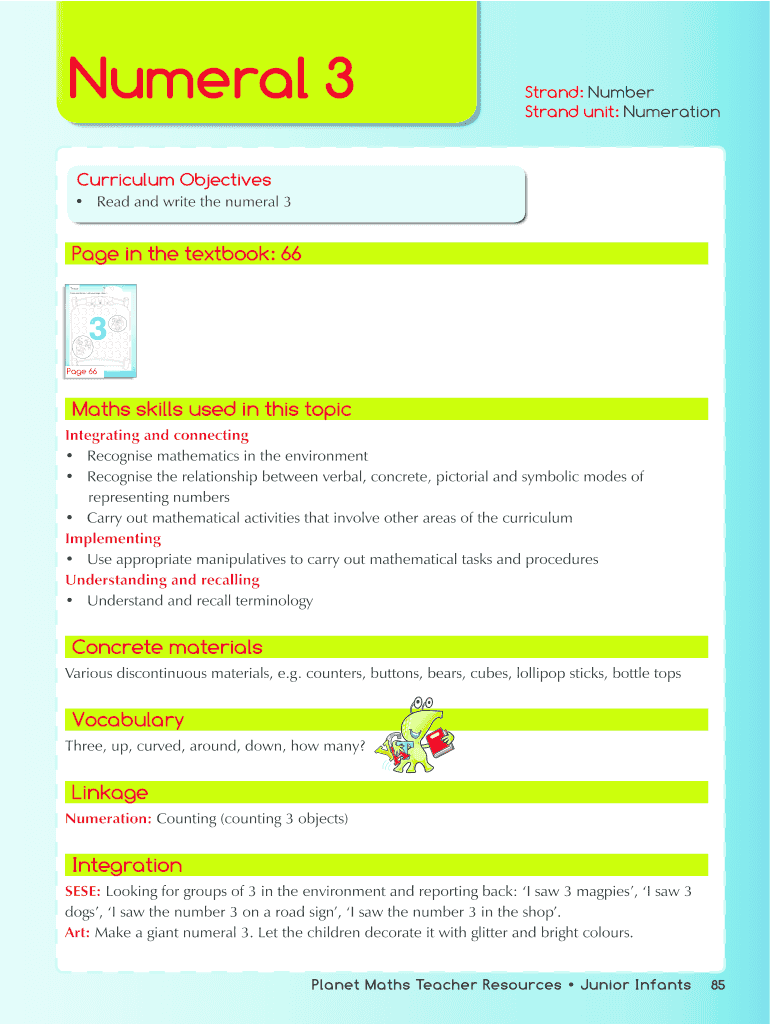 Numeral 3 Trace over the big 3 with your finger. Write 3. Page 66 66 Strand Unit Number Numeration Objectives 3 Read and write the numeral 3. Integrating and connecting Implementing Understanding