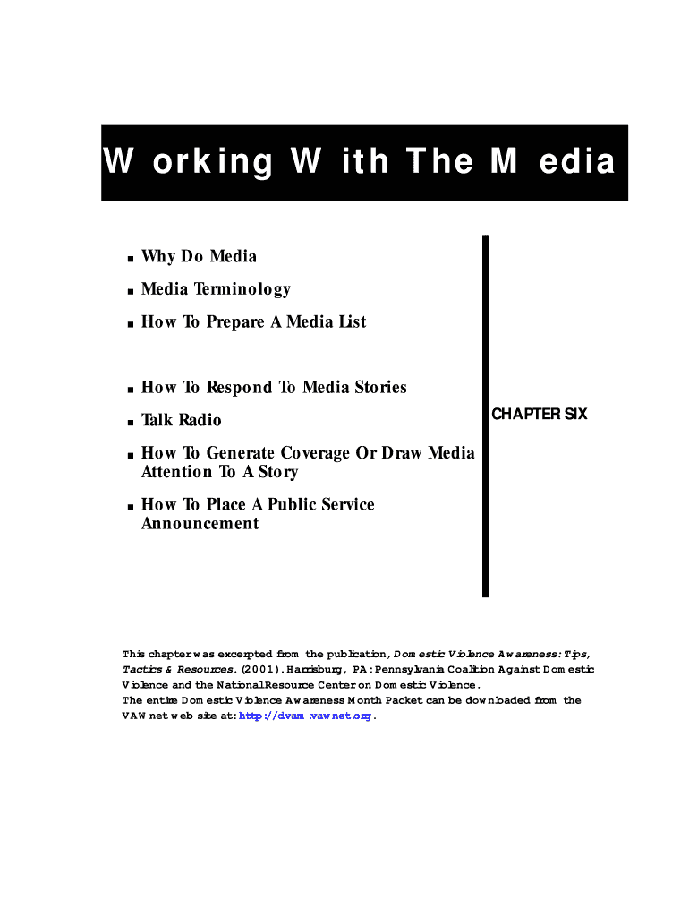 Working With The Media s Why Do Media s Media Terminology s How To Prepare A Media List s How To Respond To Media Stories s Talk Radio s CHAPTER SIX How To Generate Coverage Or Draw Media Attention