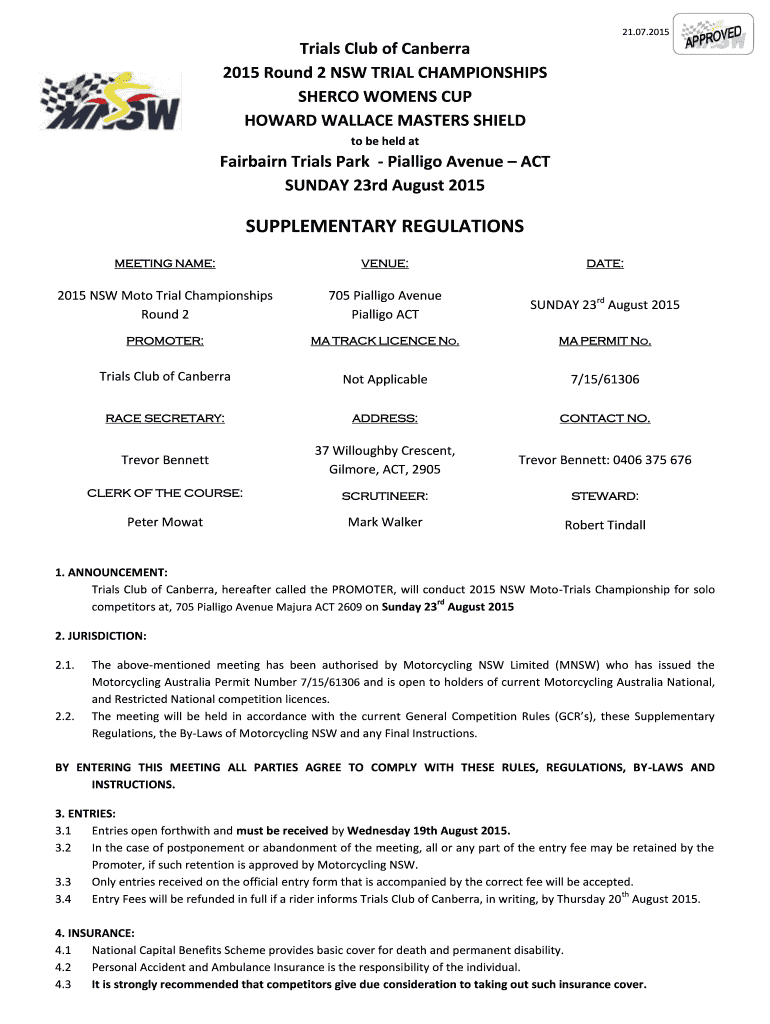 21.07.2015 Trials Club of Canberra 2015 Round 2 NSW TRIAL CHAMPIONSHIPS HERO WOMEN CUP HOWARD WALLACE MASTERS SHIELD to be held at Fair bairn Trials Park Pillage Avenue ACT SUNDAY 23rd August 2015