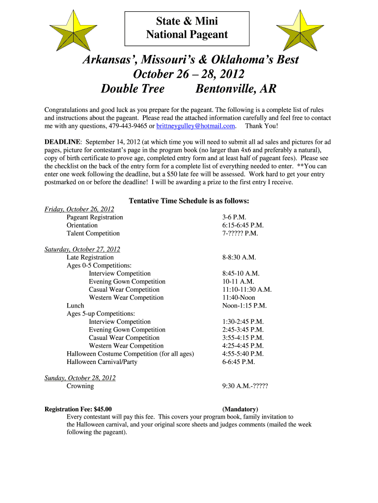 This document outlines the rules, schedules, fees, and requirements for contestants participating in the State & Mini National Pageant held in Arkansas, Missouri, and Oklahoma.