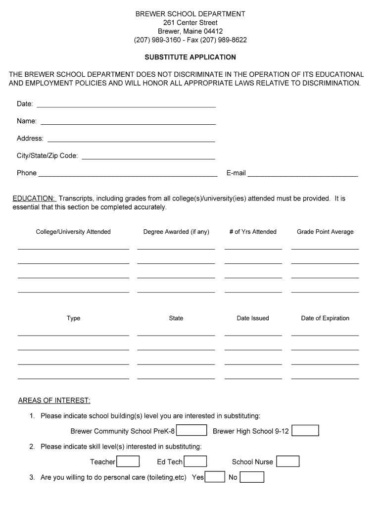 BREWERSCHOOLDEPARTMENT 261CenterStreet Brewer,Maine04412 (207×9893160Fax×207×9898622 SUBSTITUTEAPPLICATION THEBREWERSCHOOLDEPARTMENTDOESNOTDISCRIMINATEINTHEOPERATIONOFITSEDUCATIONAL ANDEMPLOYMENTPOLICIESANDWILLHONORALLAPPROPRIATELAWSRELATIVETODISCRIMINATION.