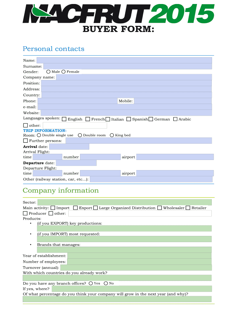 BUYER FORM: Personal contacts Name: Surname: Male Gender: Company name: Female Position: Address: Country: Phone: Mobile: email: Website: Languages spoken: English other: TRIP INFORMATION: Double