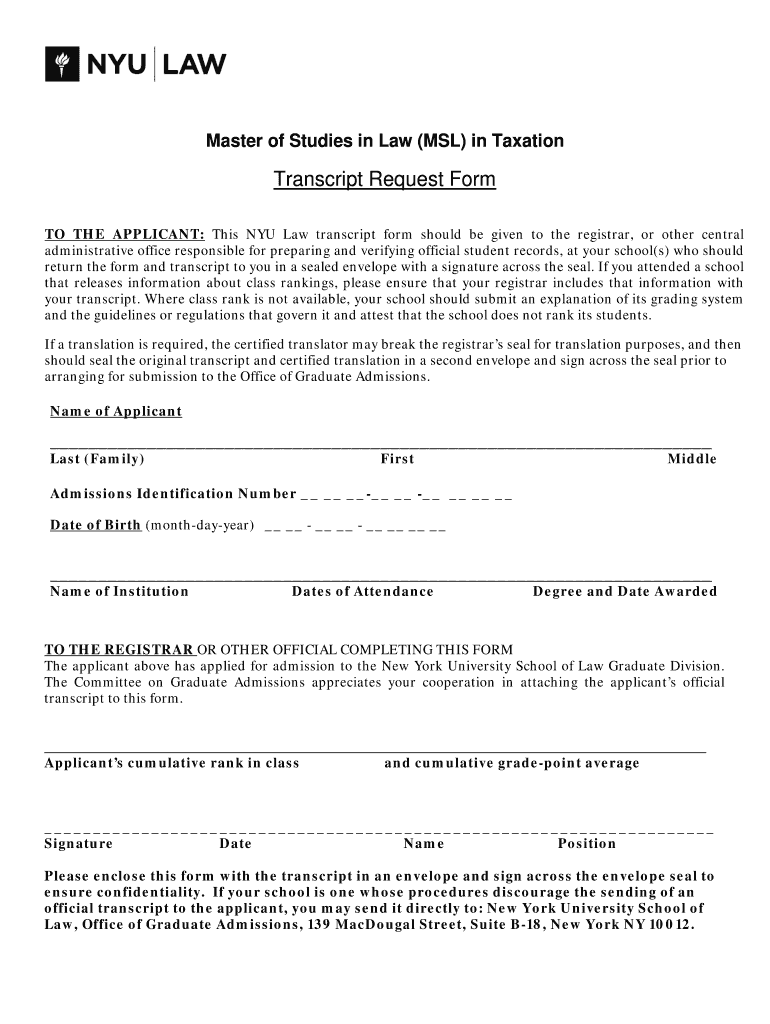 Master of Studies in Law (SL) in Taxation Transcript Request Form TO THE APPLICANT: This NYU Law transcript form should be given to the registrar, or other central administrative office responsible