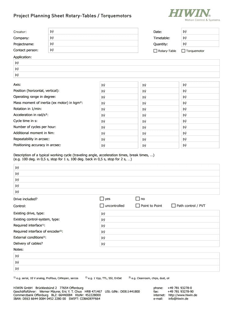 Project Planning Sheet Rotatable / Torque motors Creator: Date: Company: Timetable: Project name: Quantity: Contact person: Rotatable Torque motor Application: Axis: Position (horizontal, vertical):