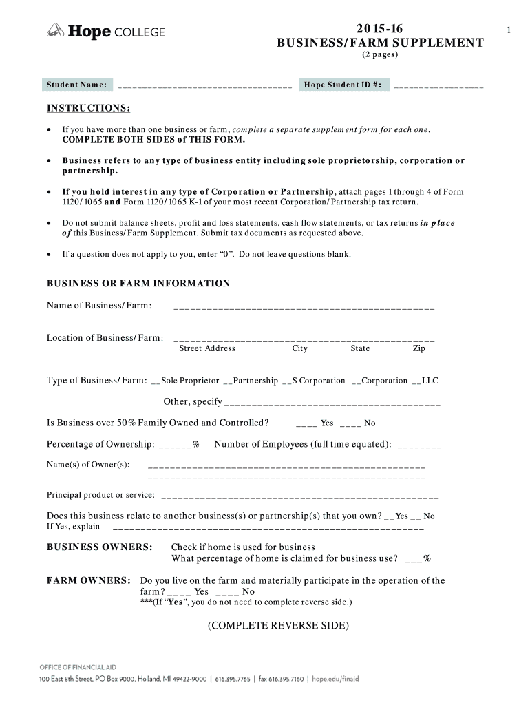 2015-16 BUSINESS×FARM SUPPLEMENT (2 pages) Student Name: Hope Student ID #: INSTRUCTIONS: If you have more than one business or farm, complete a separate supplement form for each one. COMPLETE BOTH