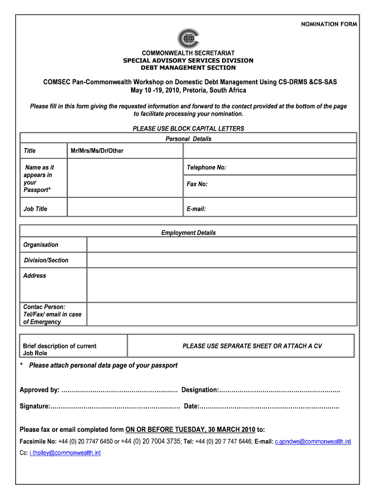 NOMINATION FORM COMMONWEALTH SECRETARIAT SPECIAL ADVISORY SERVICES DIVISION DEBT MANAGEMENT SECTION COSEC Pan Commonwealth Workshop on Domestic Debt Management Using CSD RMS SSAS May 10 19, 2010,