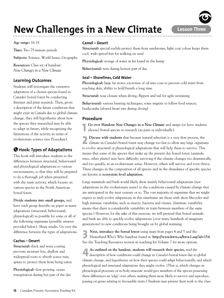 New Challenges in a New Climate Age range: 1618 Time: Two 75minute periods Subjects: Science, World Issues, Geography Resources: Class set of handout: New Changes in a New Climate Learning Outcomes
