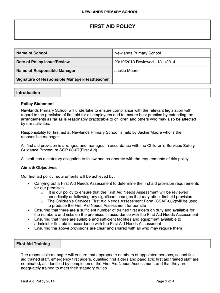 WETLANDS PRIMARY SCHOOL FIRST AID POLICY Name of School New lands Primary School Date of Policy Issue×Review 23×10/2013 Reviewed 11×11/2014 Name of Responsible Manager Jackie Moore Signature of