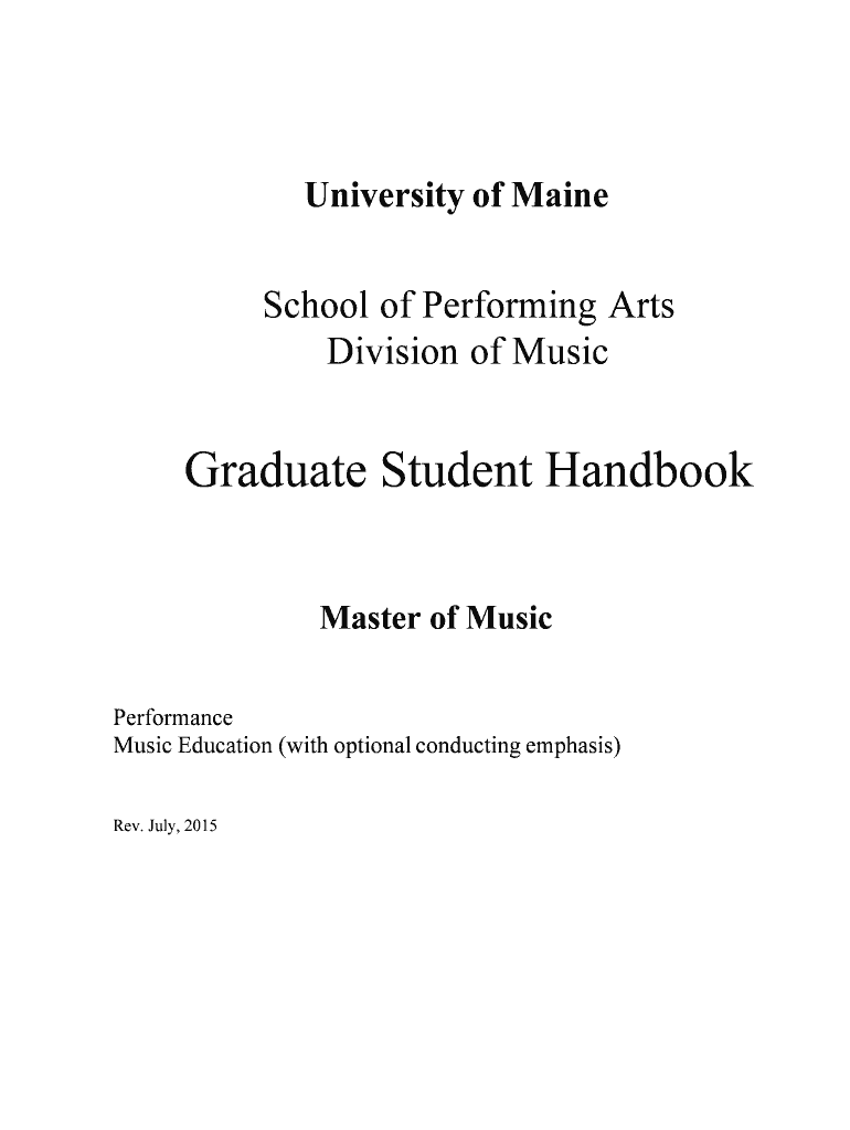 University of Maine School of Performing Arts Division of Music Graduate Student Handbook Master of Music Performance Music Education (with optional conducting emphasis) Rev. July 2015 CONTENTS I.