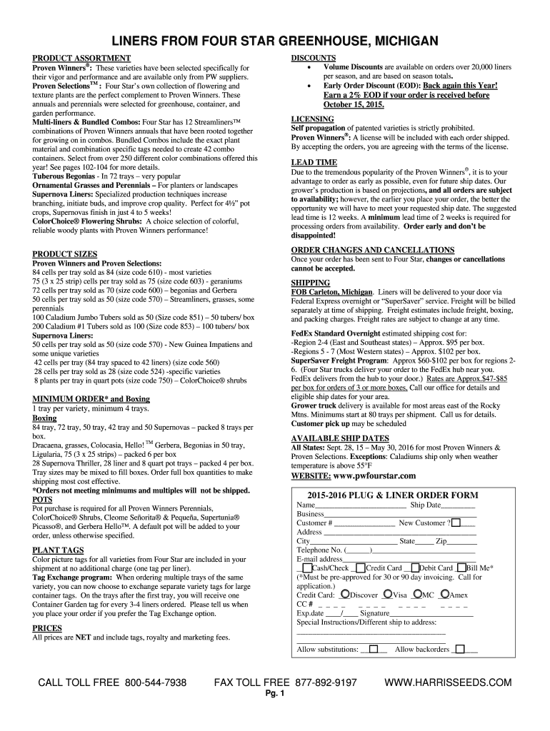 LINERS FROM FOUR-STAR GREENHOUSE, MICHIGAN DISCOUNTS Volume Discounts are available on orders over 20,000 liners per season, and are based on season totals. Early Order Discount (EOD): Back again