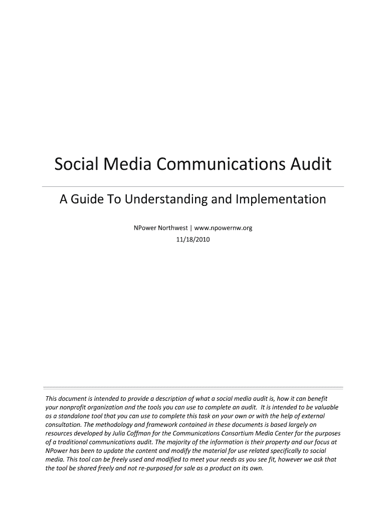 Social Media Communications Audit A Guide To Understanding and Implementation Power Northwest www.npowernw.org 11×18/2010This document is intended to provide a description of what a social media
