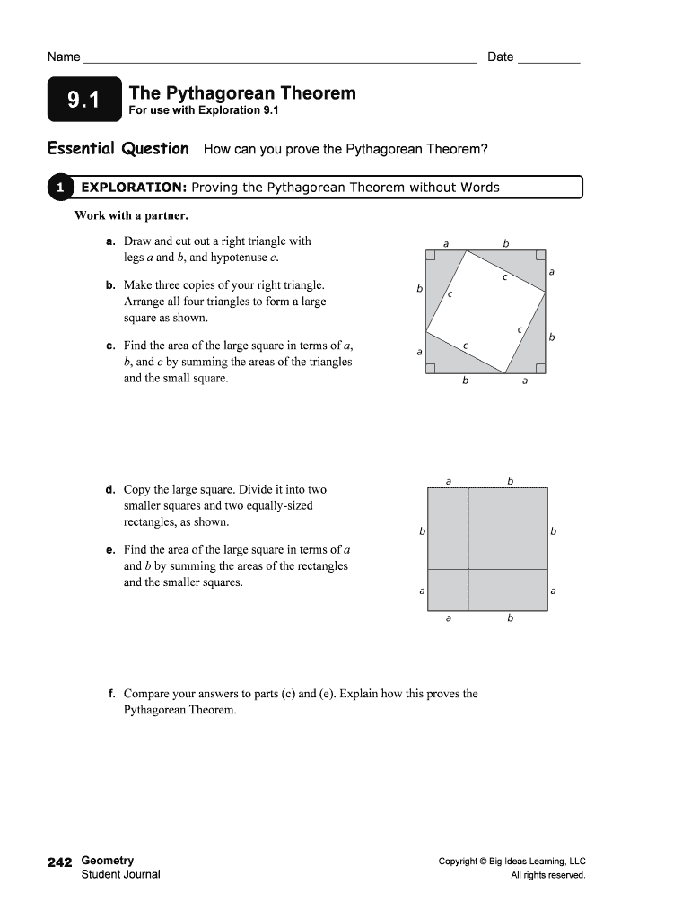 Name Date 9.1 The Pythagorean Theorem For use with Exploration 9.1 Essential Question How can you prove the Pythagorean Theorem? 1 EXPLORATION: Proving the Pythagorean Theorem without Words Work with