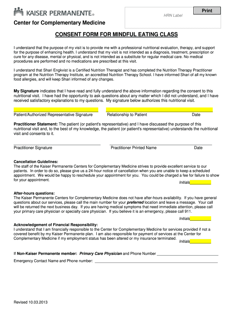 Get the free HRN Label Center for Complementary Medicine CONSENT FORM - kpccm